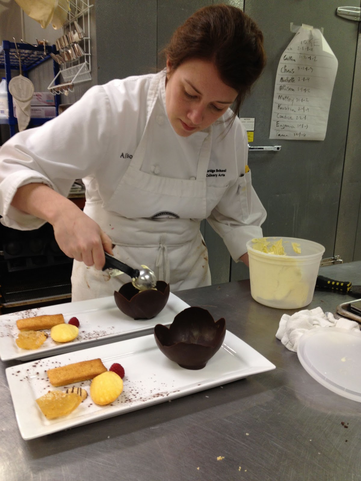 We're evaluated in two parts: our recipe writing and kitchen work, and our presentation and execution. Once my cookies were completed, and my ice cream was chilled, I had to bring the whole thing together. Because cookies and ice cream are rather independent items, my biggest challenge was presenting something to the evaluation team that made sense relative to the components, was visually appealing, and that might have an element of technical difficulty (I didn't want to risk giving up points by throwing cookies on a plate, next to a bowl of ice cream). Our plating options are limited.....so what's a pastry girl to do? Duh, make a bowl for the ice cream out of chocolate.